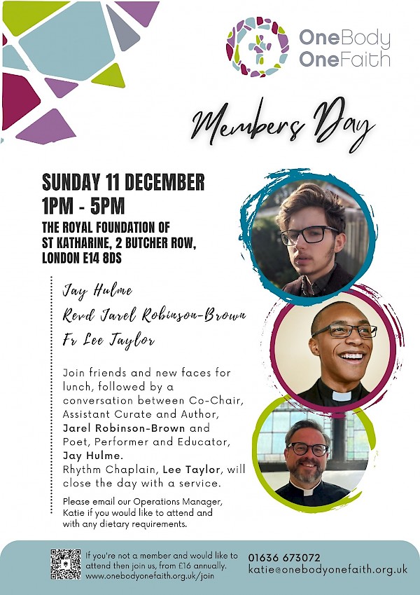 Please join us for an afternoon among friends and new faces at OneBodyOneFaith’s Members Day, our first in-person meet-up in 3 years. Meeting on Sunday 11 December, 1-5pm, at The Royal Foundation of St Katharine, London, you will enjoy a delicious lunch, followed by a conversation between Co-Chair, Assistant Curate and Author, Jarel Robinson-Brown and Poet, Performer and Educator, Jay Hulme. Rhythm Chaplain, Lee Taylor will close the day with a service.