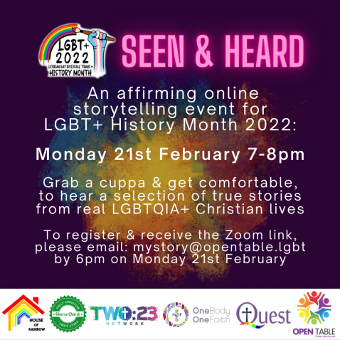 To register & receive the Zoom link, please email: mystory@opentable.lgbt by 6pm on Monday 21st February.